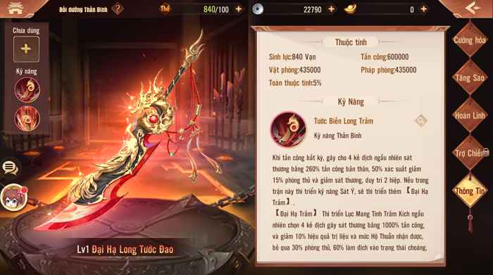 • Kỹ năng thần binh: Khi tấn công bất kỳ, gây cho 4 kẻ địch ngẫu nhiên sát thương bằng 260% tấn công bản thân, 50% xác suất giảm 15% phòng thủ và giảm sát thương, duy trì 2 hiệp. Nếu trong trận này thi triển kỹ năng Sát Ý, sẽ thi triển thêm [Đại Hạ Trảm].